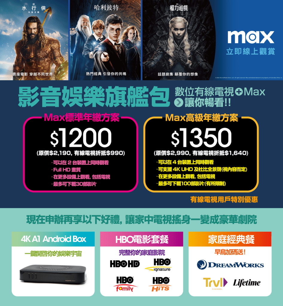 凱擘大寬頻用戶專屬優惠,現在申辦HBO Max,年約最低只需 每月$100起,還可享受額外好禮,包括HBO電影套餐、4K Android Box !
