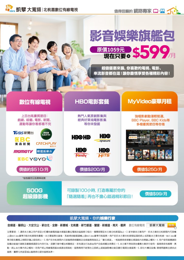 有線電視推出影音娛樂旗艦包,含數位有線電視、HBO、MyVideo、錄影機等服務,每月僅 $599!用戶輕鬆享受總價值超過千元的多樣娛樂服務!